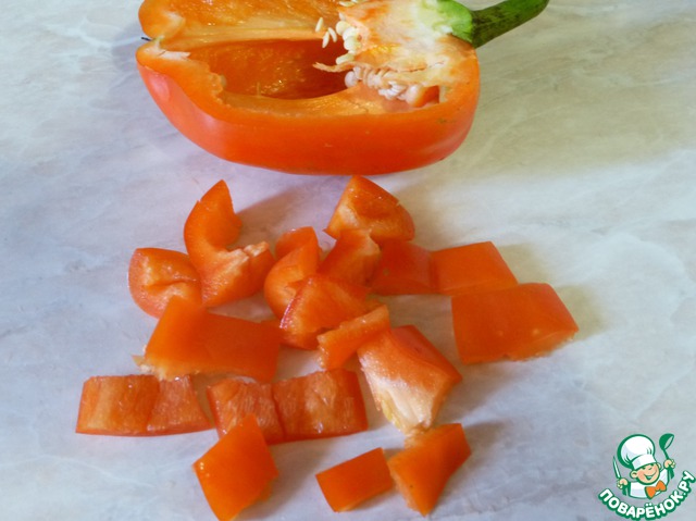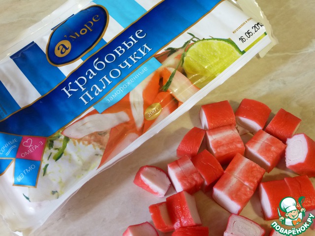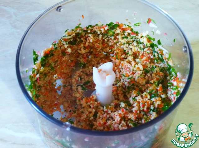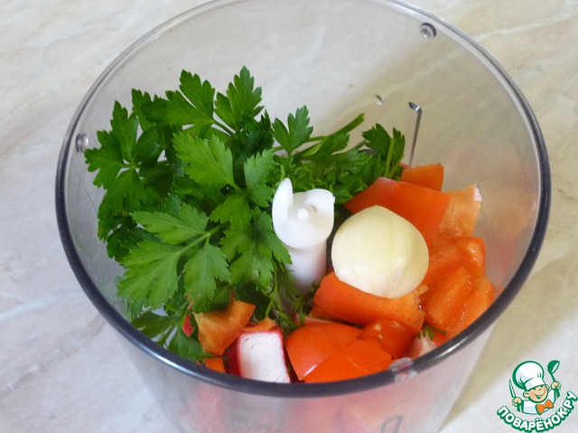 В чашу блендера отправить нарезанные крабовые палочки, сладкий перец, чеснок и зелень.