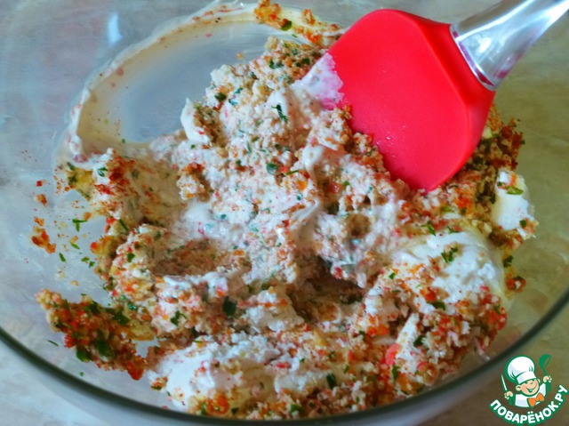 В чаше смешать полученную массу с творогом, йогуртом и паприкой, посолить по вкусу.
