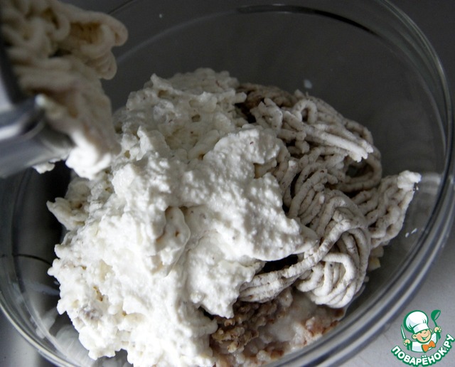 Пропустить сельдь вместе с молоком, орехами, творогом 2 раза через мясорубку.