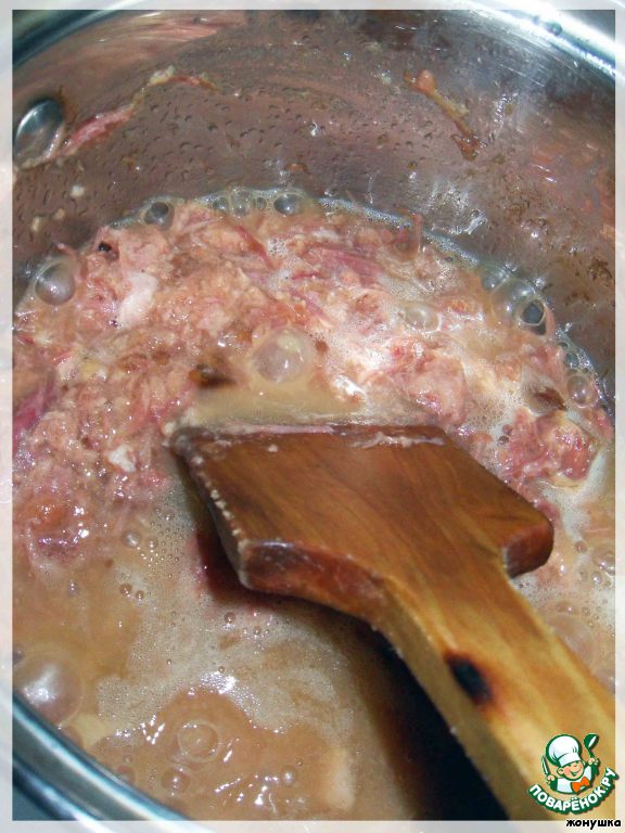 Банку тушенки открыть и снять верхний жир, выложить массу с соком в кастрюльку и тушить на среднем огне, постоянно помешивая 15 минут, пока сок не уварится немного и масса не загустеет.