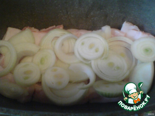 Теперь кладем слой лука (конечно, предварительно очищенного), порезанного кольцами так же - в палец толщиной.