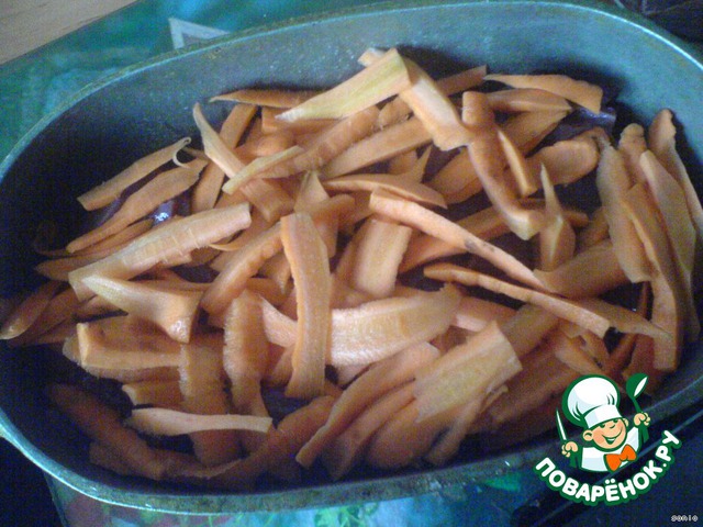 Затем слой моркови, которую режу пластинками (не в палец, а потоньше).