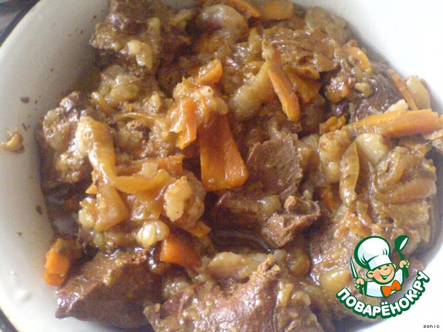 Все, закрыли крышечку, поставили на самый медленный огонь, какой есть, и можете заниматься чем угодно, в рамках приличия, конечно. А жаровенка наша (можно кастрюлька с толстым дном), стоит себе на маленьком огне, томится 3,5-4 часа.