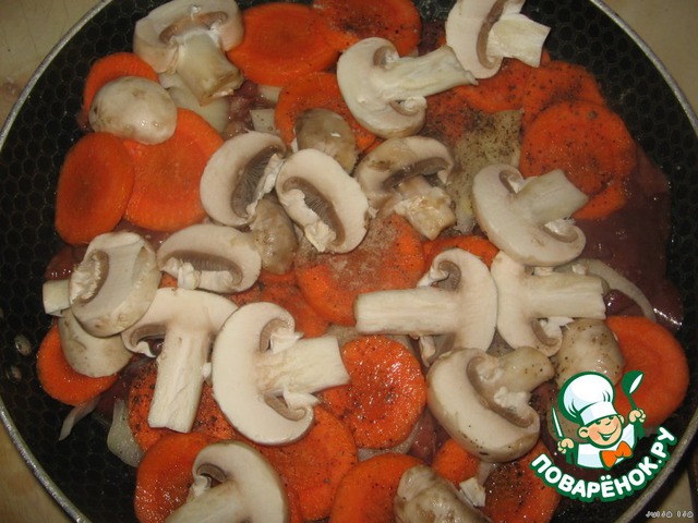 На печень выкладываем лук, нарезанный толстыми полукольцами, и морковь колечками.