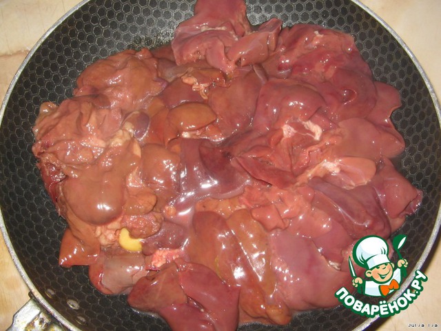 Далее к луку добавляем печень и обжариваем всё вместе.