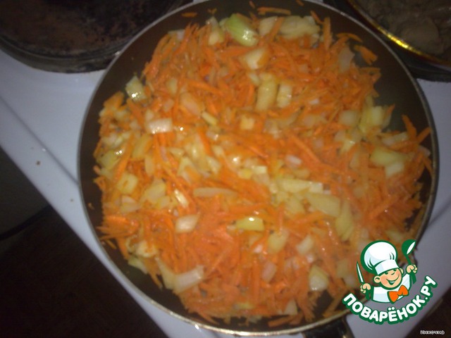 Морковь натереть на крупной тёрке, лук мелко нашинковать.Поджарить на слив. масле.