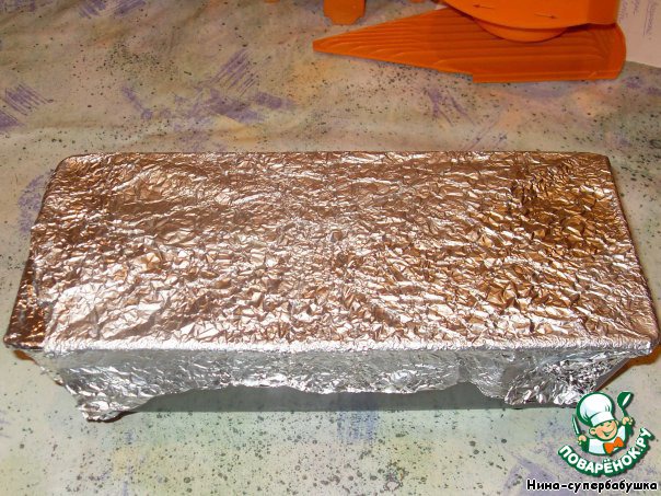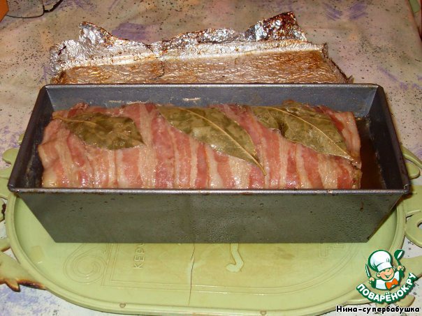| Вообще-то, это что-то вроде паштета. Название террин возникло от формы, в которой он запекается. Продолговатая форма с крышкой. У меня такой нет. Поэтому я запекала в обычной продолговатой форме, а закрывала фольгой. Голь на выдумки хитра!!! Гостям блюдо понравилось, смели подчистую!!! |