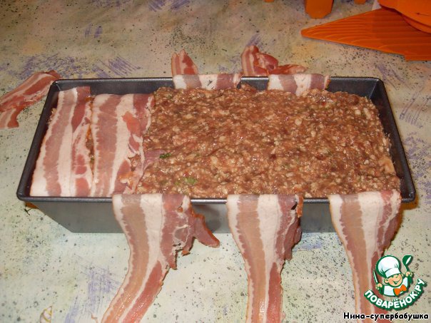 Бока формы выложить в шахматном порядке полосками бекона так, чтобы они свисали с краев. На дно постелить бумагу для выпечки.