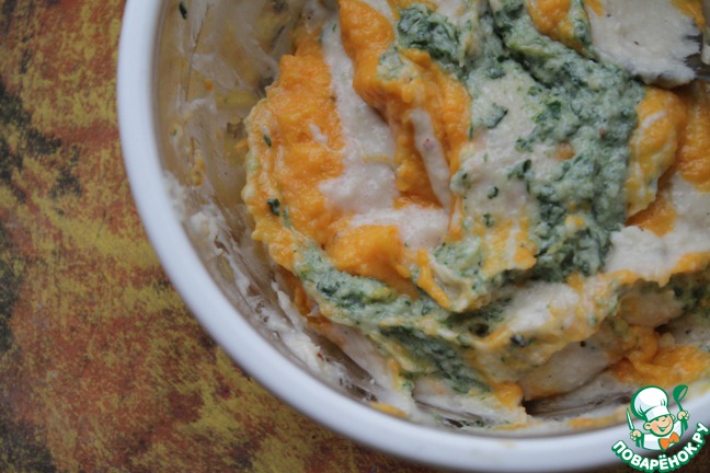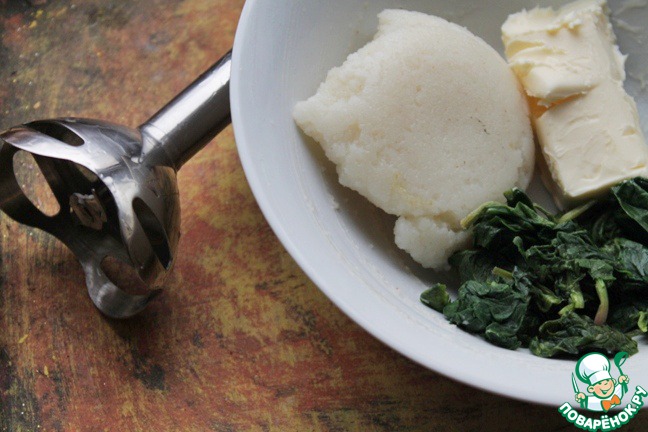 Шпинат размороженный (обдать кипятком), манную кашу и ещё 50 г. масла превратить во второй вид паштета. Шпинат, я считаю более самодостаточным продуктом, поэтому сюда я чеснок не добавляю, но можно!