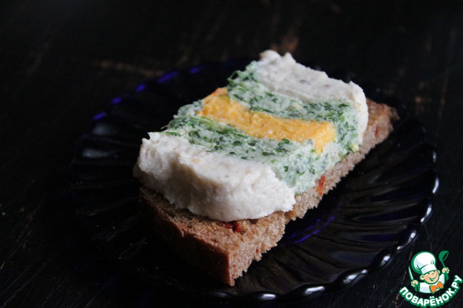 Если нужно сразу подавать, тогда все три паштета слегка перемешать (не сильно!) и порционно выложить на печенье/хлеб/крекеры.