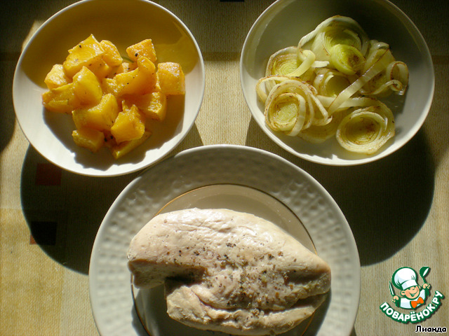 Тыкву я тоже запекала, предварительно нарезав ее на маленькие кусочки, сбрызнув оливковым маслом и посыпав солью. По рецепту и то, и другое нужно просто отварить, но мне нравится больше запекать эти продукты.