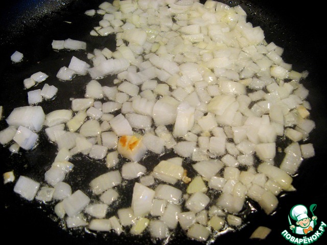 Мелко порезать и обжарить лук на растительном масле до прозрачности.