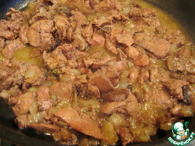 Порезать куриную печенку и грибы, добавить к луку и тушить. В конце добавить соль, все специи, коньяк и потушить еще 3 минуты. Главное не пережарить печенку, она должна внутри остаться чуть розоватой.