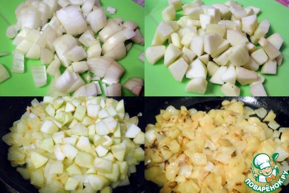 Тем временем почистим лук и яблоки и нарежем их кубиками. В сковороде растопим 50г масла и обжарим на нем лук, как только станет прозрачным, добавим яблоки и тушим до тех пор, пока яблоко не станет мягким.