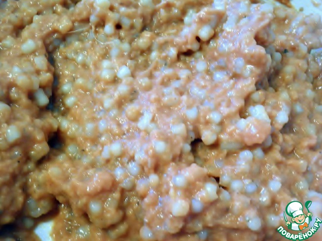 Осталось совсем немного. В полученную массу высыпаем сваренное саго и добавляем томатную пасту. Солим-перчим по вкусу и хорошо перемешиваем.