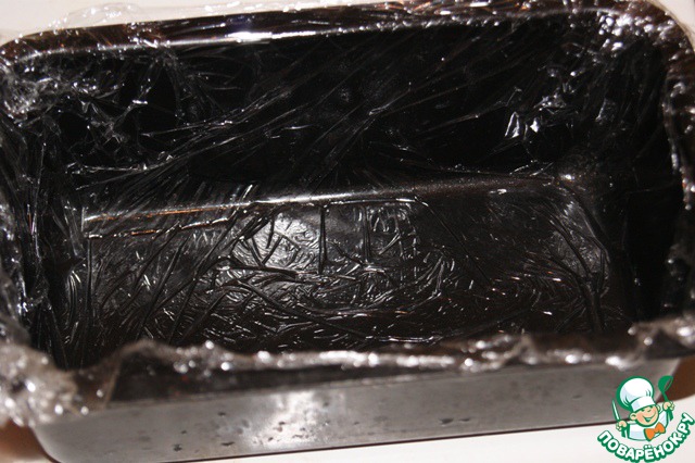 Форму размером 20х10 см смочить и накрыть полностью пищевой пленкой.