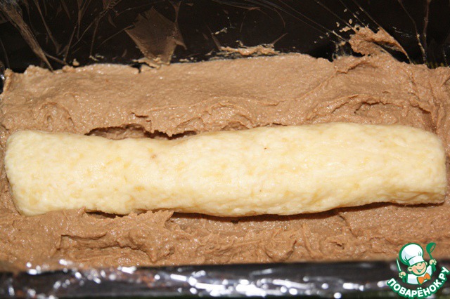 Нанести ровным слоем (осторожно, чтобы не повредить застывшее желе) половину паштета. Сверху слегка вдавить застывшую сырную колбаску, не забыв удалить пленку.