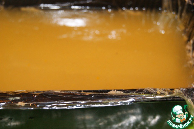 Налить на дно тонкий слой бульона и поместить в холодильник. Дать полностью застыть.
