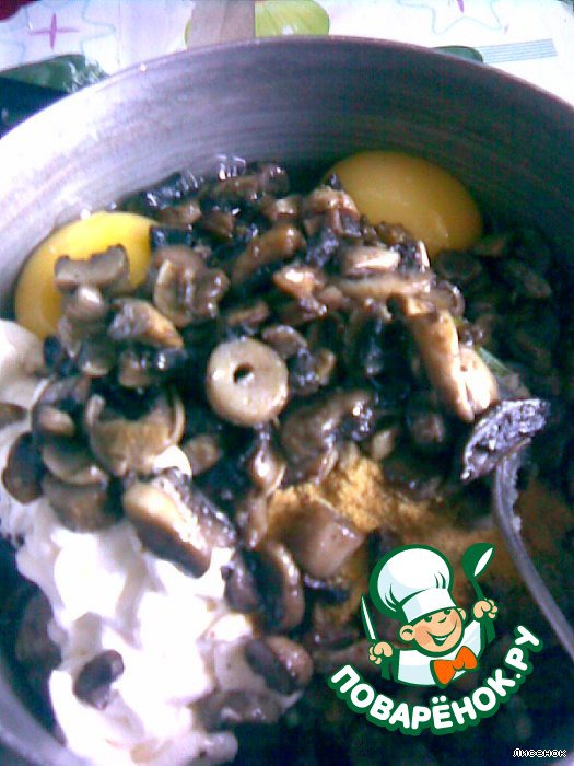 Грибы почистить и обжарить. Лук измельчить. Смешать лук, грибы, фарш, яйца, сметану, сухари, специи. Форму выстлать фольгой, оставив края побольше. Выложить фарш и закрыть плотно фольгой. Запекать в духовке 25 минут, при температуре 180 -200. За пять минут до окончания фольгу открыть, чтоб зарумянилось.