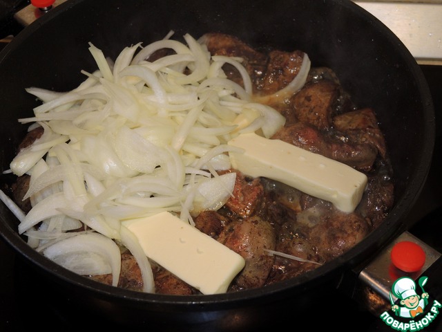 Добавляем к печени тонко нашинкованный лук и сливочное масло, тушим еще 10 минут.