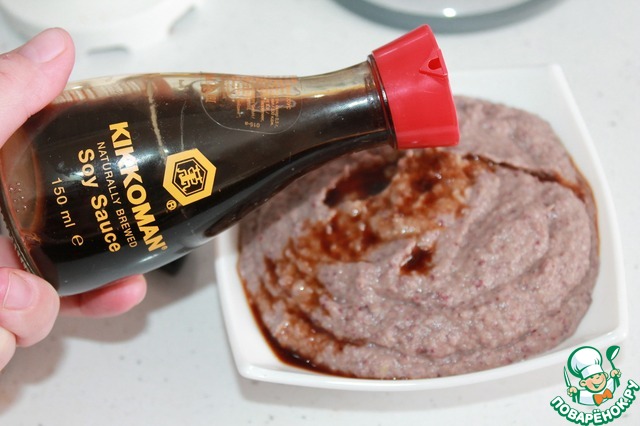 Добавляем соевый соус Kikkoman, перемешиваем. По желанию добавляем соль и перец. Мне достаточно было соевого соуса. Настоятельно рекомендую использовать соевый соус, так как с ним паштет становится мягче и ярче на вкус. Паштет прекрасно сочетается с черным хлебом и солеными огурчиками.