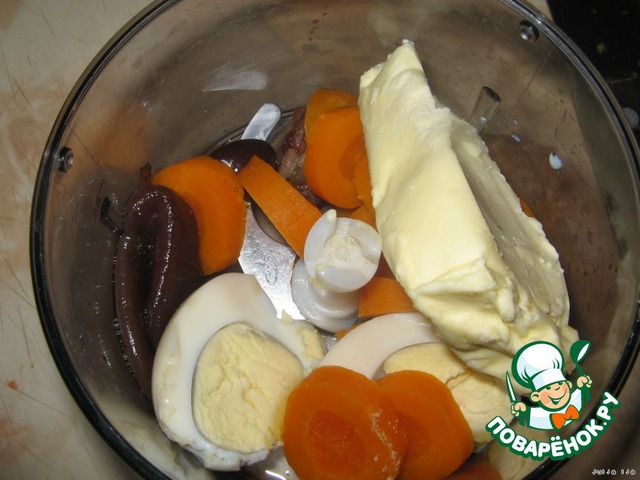 Я всё измельчаю в блендере. Икра, молоки, морковь (она должна быть очень мягкой, даже слегка переварить можно), яйцо, сваренное вкрутую и сливочное масло, лучше мягкое.