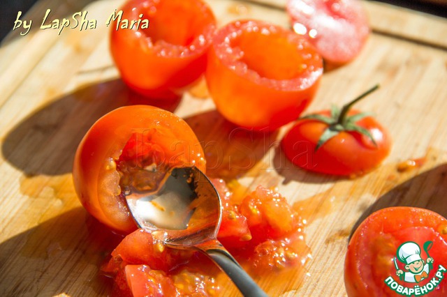 У помидорок черри отрезать верхушку. Очень аккуратно ножом надрезать деления томата, а затем маленькой ложечкой вытащить всю мякоть. На самом деле это не сложно, но требует немного внимательности.
