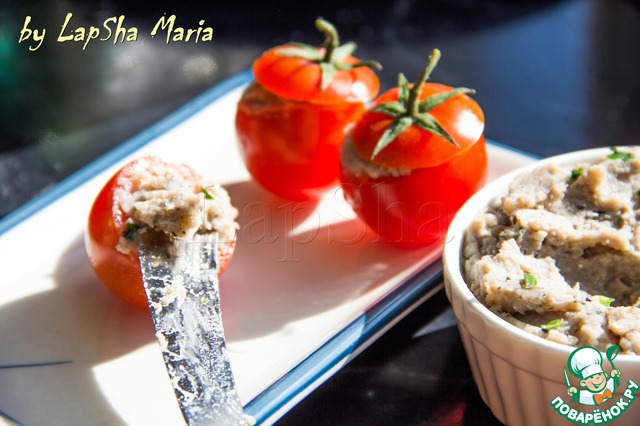 Каждую помидорку присолить изнутри и наполнить паштетом. Сверху накрыть шляпкой и можно подавать к столу!