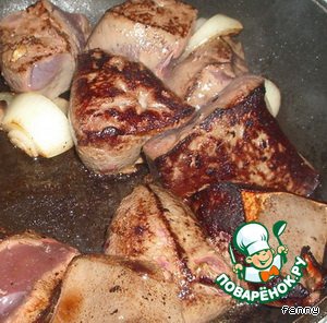 Кусочки печени, измельченный чеснок и лук обжарьте, помешивая, до полуготовности.