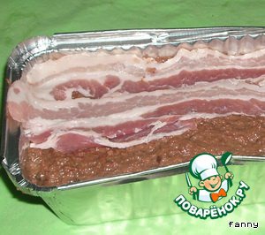 Выложите паштет в форму, сверху разложите ломтики сала, закройте промасленной бумагой, форму поставьте на противень с горячей водой и поместите в горячую духовку на 1,5 часа.