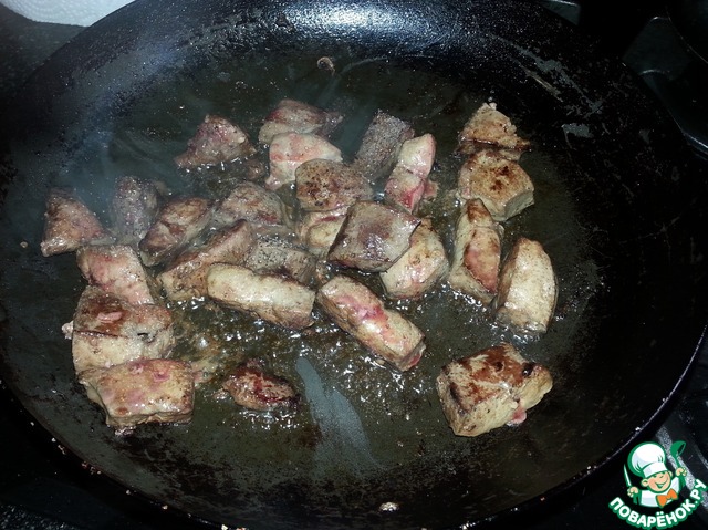 Печень очистить от пленок, порезать кубиками, обжарить на растительном масле.