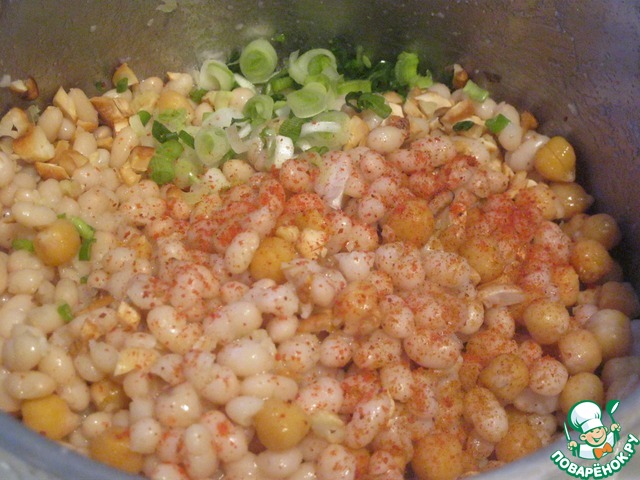Смешать фасоль, нут, нарезанную зелень, рубленный чеснок и орехи (можно заменить грецкими или добавить вместе с кешью). Всыпать пряности по вкусу.