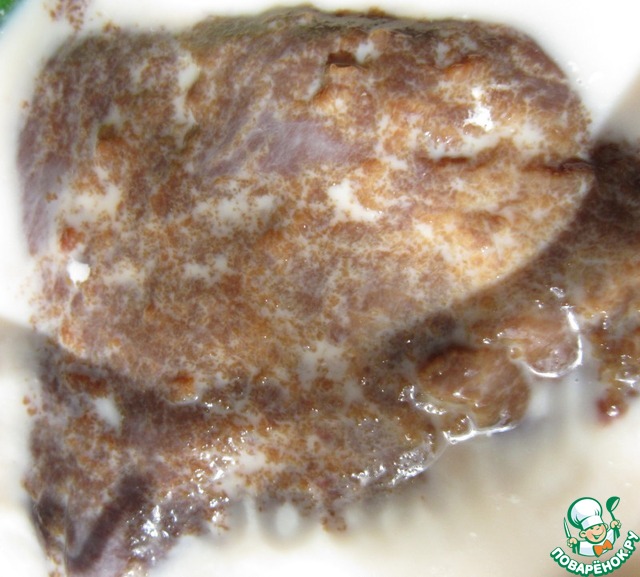 Для начала вымочим свиную печенку в молоке в течение часа.