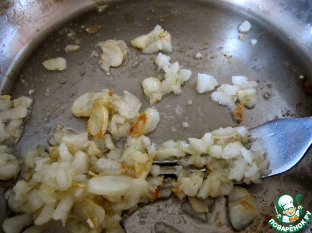 Растопить 1 ст. л. смальца в глубокой сковородке, добавить крупно порезанный чеснок, обжарить до мягкости.