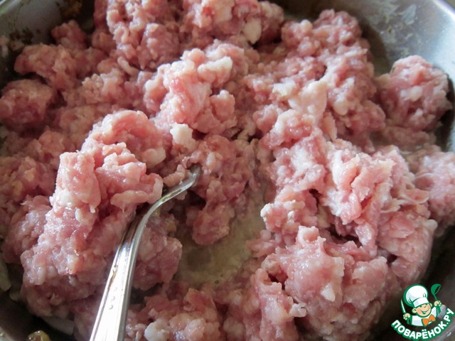 Растопить еще одну ложку смальца и обжарить в нем МЕЛКО нарезанную луковицу. Добавить свинину. Жарить до полной готовности мяса (можно подливать немного воды), в конце посолите по вкусу.