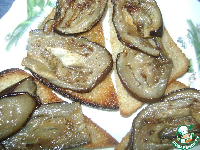 Для брускетты фасолевой нам понадобится хлеб постный (можно купить в магазине). Нарезать на кусочки, обжарить с двух сторон на подсолнечном масле до золотистого цвета, натереть чесноком. Баклажан нарезать кольцами, обжарить на масле с двух сторон. На хлеб выкладываем баклажаны.