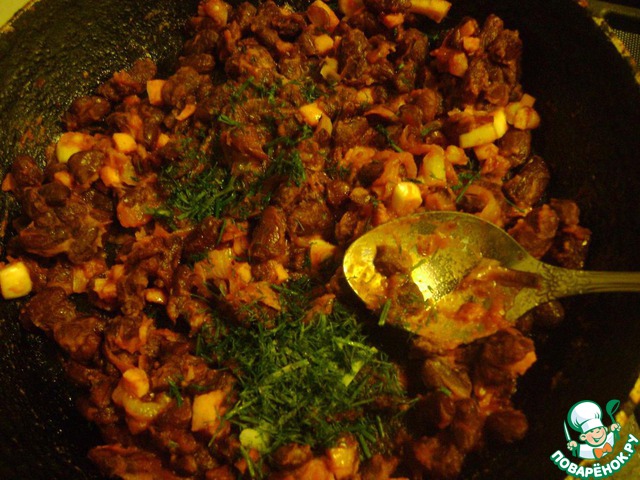 Пока фасоль варится, на сковороде с растительным маслом и сахаром поджарить лук, нарезанный кольцами. Несколько колечек отложить для украшения фасолевого цимеса.