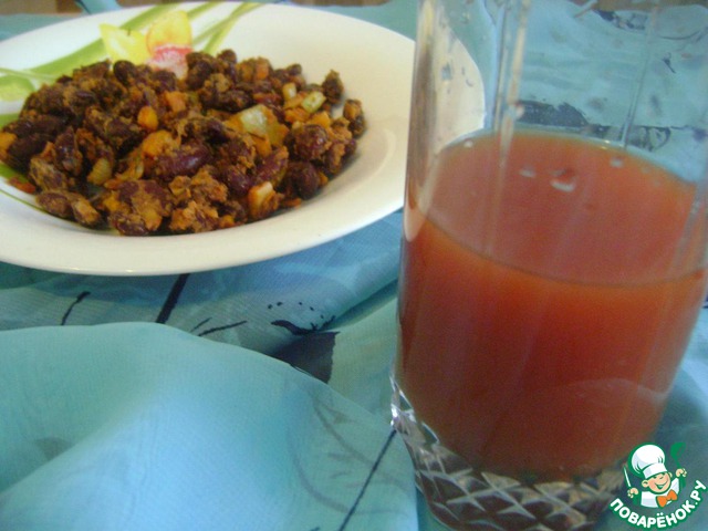 В остывшую фасоль налить томатный сок, перемешать, измельчить в блендере.