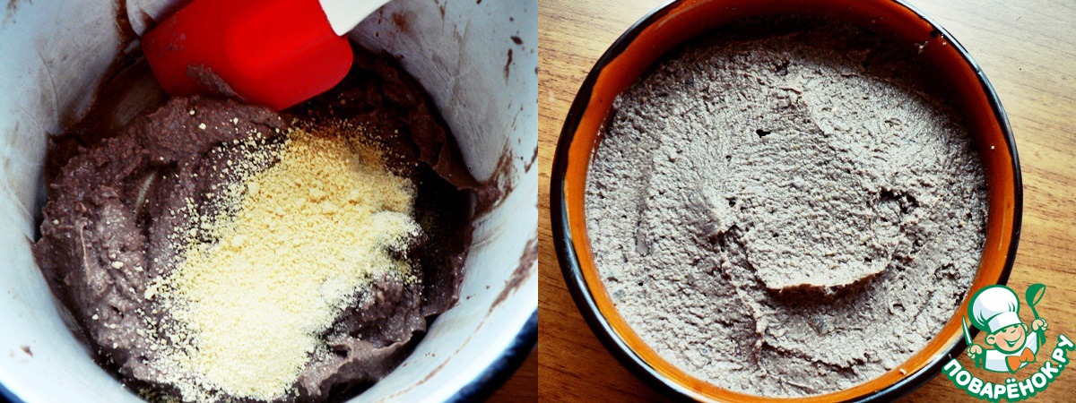В паштет высыпать пармезановый порошок, тщательно перемешать.