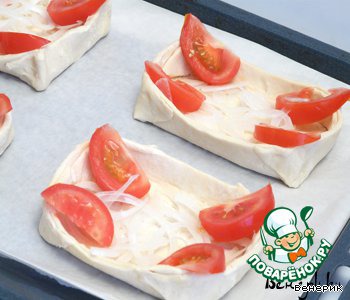 Засыпать дно теста нарезанным репчатым луком, в уголки положить по дольке помидора, выпекать в нагретой до 180*С духовке примерно 10 минут, чтобы тесто немного подрумянилось.