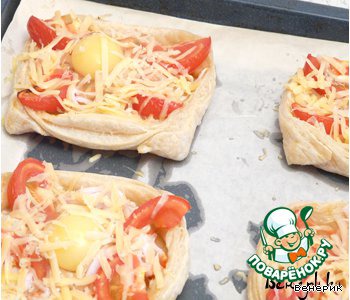 Вынуть противень из духовки, посыпать нарезанным беконом, разбить яйцо, посолить, поперчить, натереть сыр, и отправить в духовку ещё на 5-10 минут.