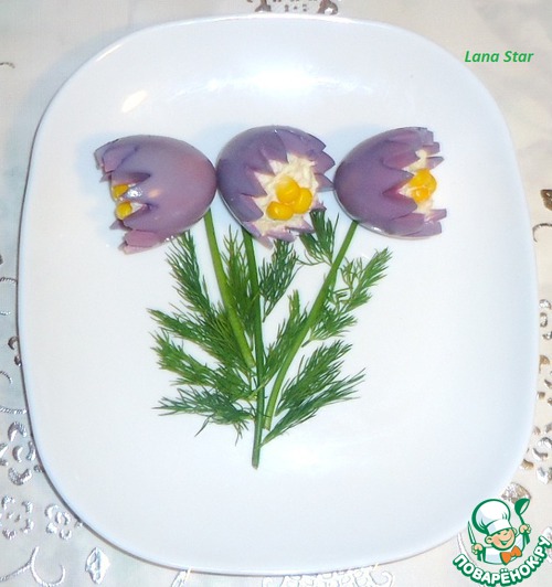 | Подснежники - это первые цветы весны. Подснежники бывают разных форм и расцветок. Фаршированные яйца - частый гость на праздничном столе, предлагаю рецепт и идею оформления закуски из яиц. Примечание: в данном рецепте используются только натуральные красители. |