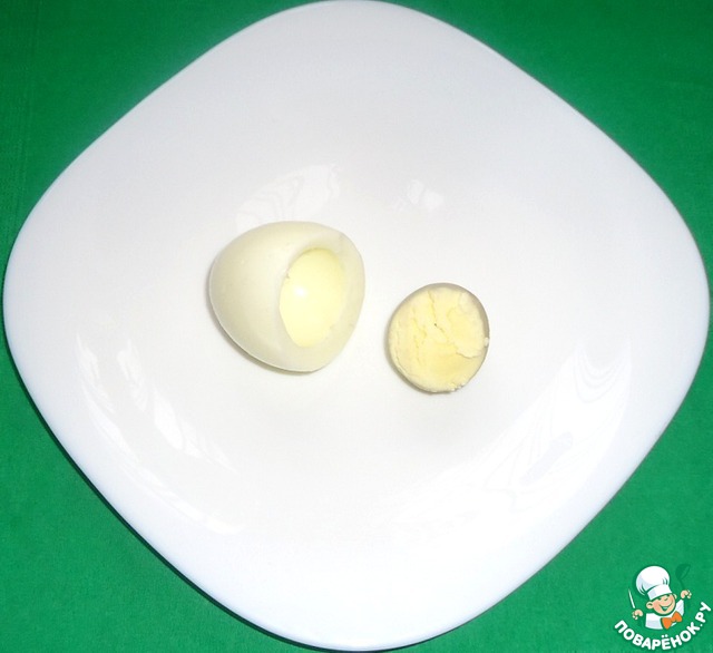 Яйца отварить, очистить и разрезать каждое как показано на фото.