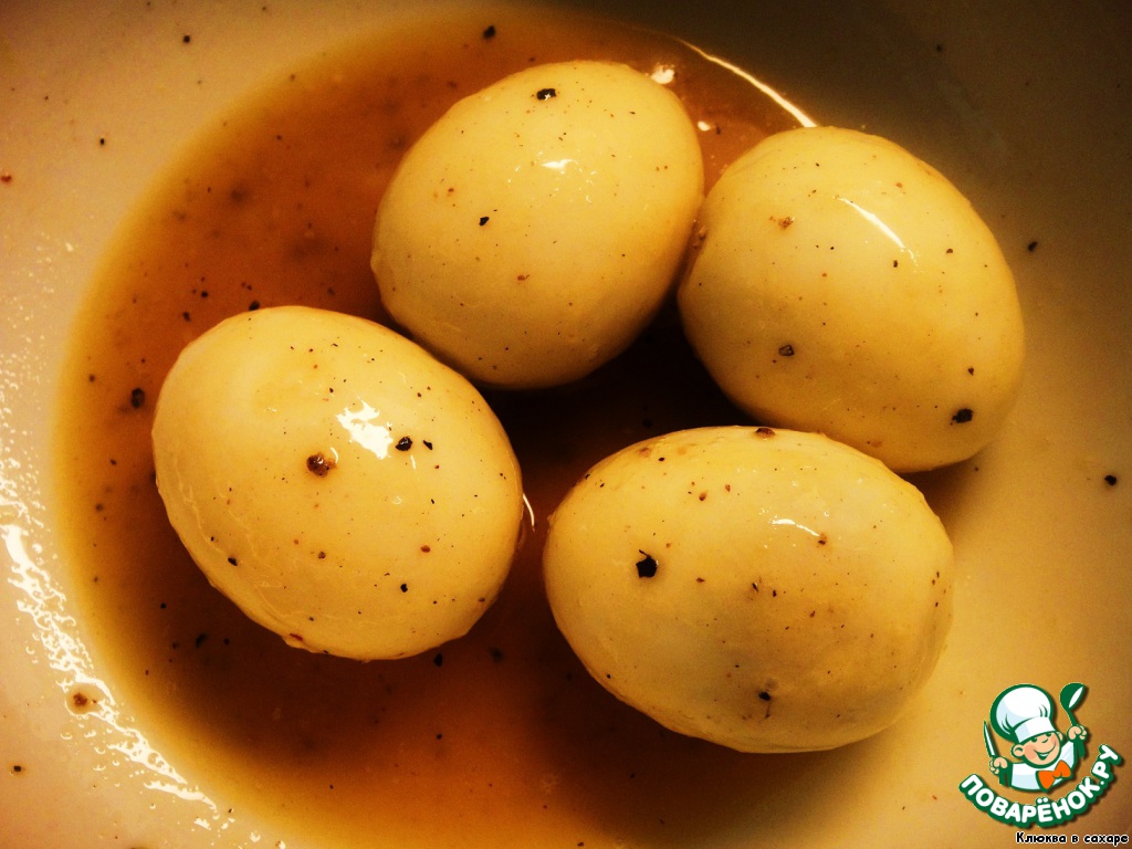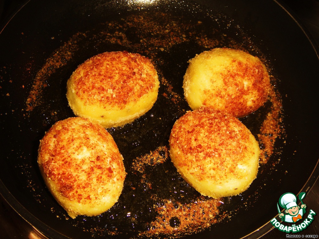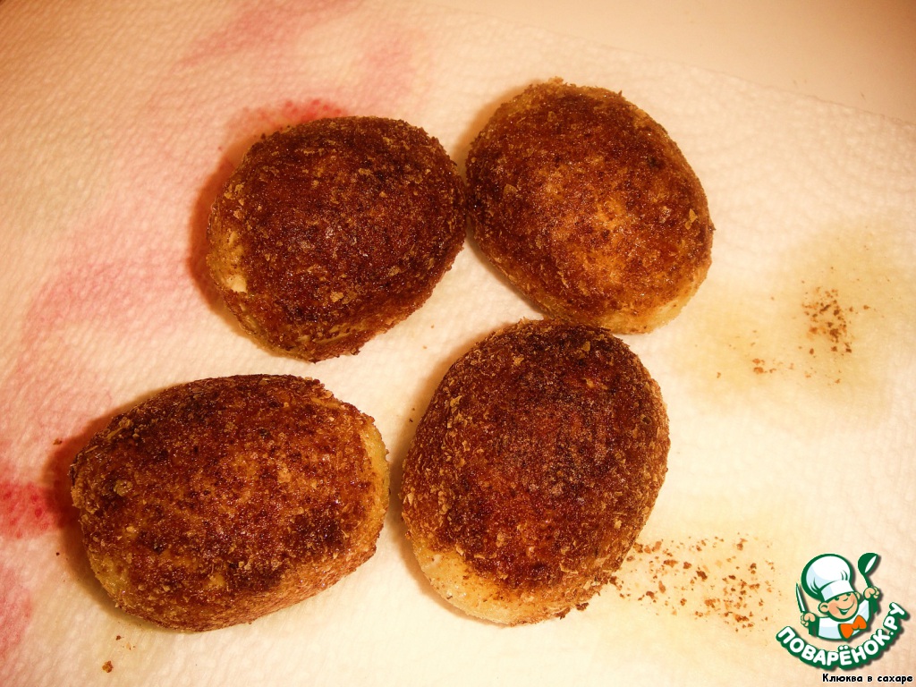 На разогретой сковороде (с щедрым количеством растительного масла) равномерно обжариваем обваленные яйца до золотистой корочки. Ещё лучше воспользоваться фритюрницей. Следите внимательно: поджариваются очень быстро!
