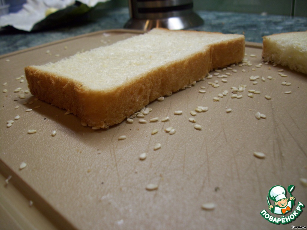 на разделочную доску высыпаем кунжут, переворачиваем хлеб маслом вниз и слегка прижимаем