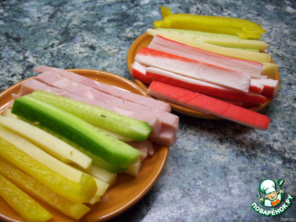 Тем временем, режем брусочками ветчину и/или крабовые палочки, сыр, огурец и/или сладкий перец – то, что Вы больше любите. У меня – ассорти.