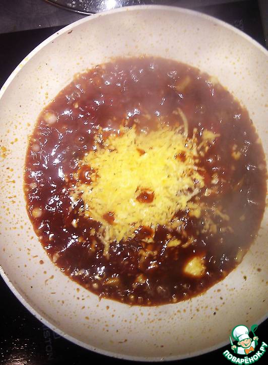 Помидоры чистим от шкурки и в сковороду вместе с кетчупом и остальным сыром.