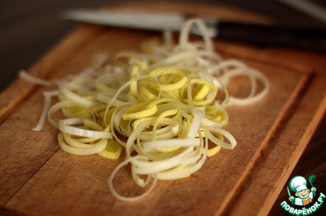 Для создания итальянского завтрака нам потребуется порезать лук-порей кольцами.
