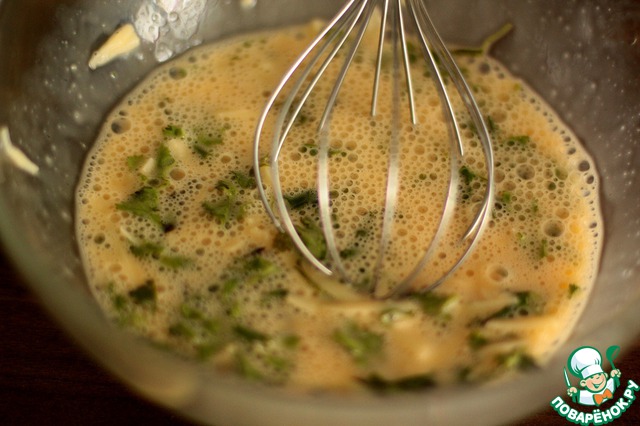 В глубокой миске смешайте яйца, зелень, у меня была кинза, но подойдет петрушка или укроп, и пармезан. Добавьте по вкусу соль и перец.