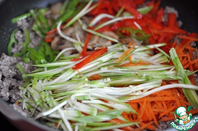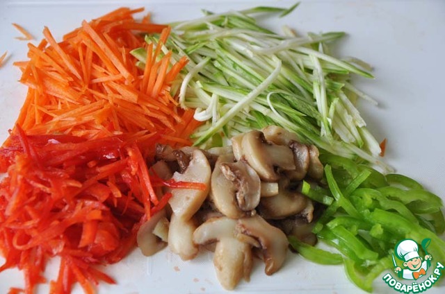 Овощи (морковь, цуккини, болгарский перец, перец чили, шампиньоны) моем, чистим и используем нарезку типа "жюльен". Я сама впервые услышала, что именно так называется нарезка тонкими полосками.